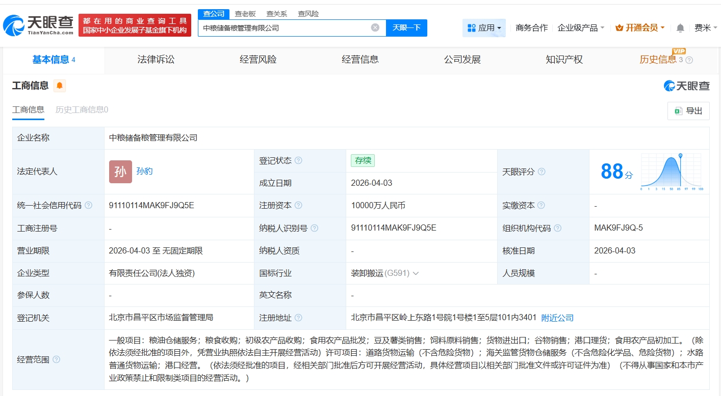 【大河财立方消息】天眼查App显示,近日,中粮储备油管理有限公司、中粮储备粮管理有限公司成立,法定代表人分别为李诚琨、孙豹,注册资本均为1亿人民币,经营范围包括粮油仓储服务、粮食收购、初级农产品收购等,上述两家公司均由中粮产业投资有限公司全资持股。