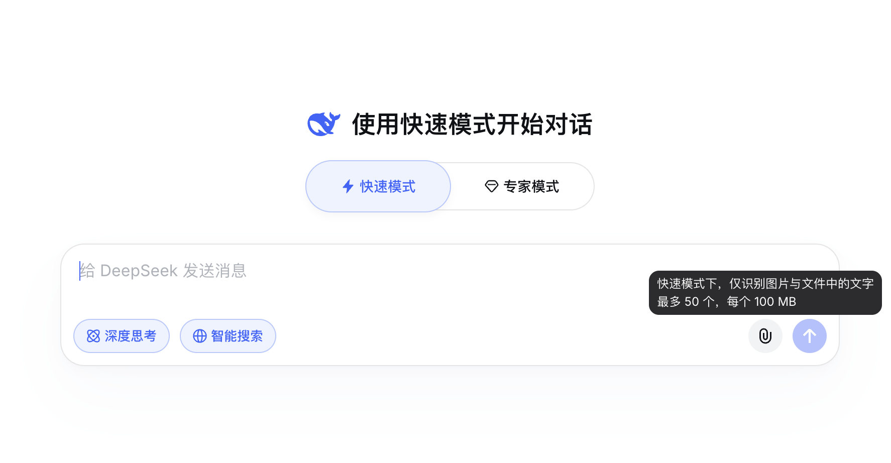 页面显示,快速模式主打即时响应,适用于日常对话,支持图片及文件中的文字识别,最多支持50个,每个100M。专家模式则针对复杂问题,高峰时需要等待,但当前暂不支持文件上传及多模态功能。