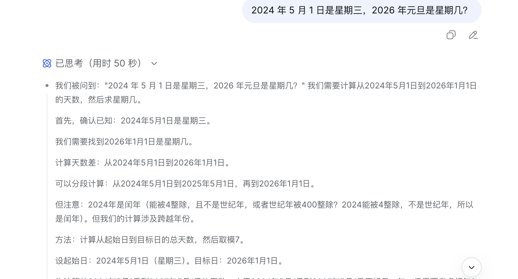而针对“2024 年 5 月 1 日是星期三,2026 年元旦是星期几”这样的问题,涉及跨年跨月闰年计算,无论是快速模式还是专家模式,回答的用时都在50秒左右,答案也都正确。这意味着,选择快速模式在做复杂推理时,可能也无法更快。