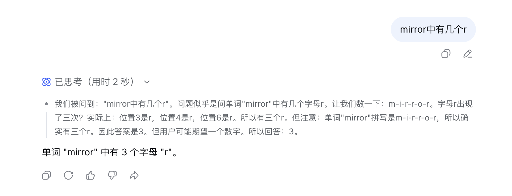 例如,“mirror中有几个r”这样的问题,快速模式思考2秒就得到了答案,但是专家模式需要4秒。