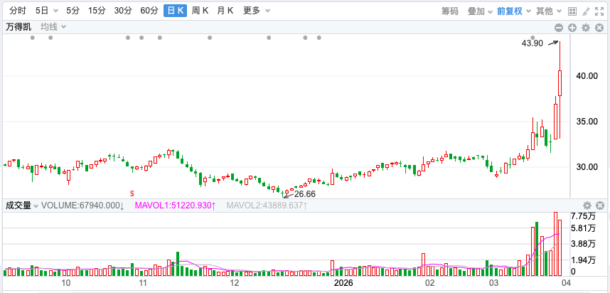 4月8日,万得凯股票复牌大涨,截至上午收盘涨幅为9.83%报40.54元/股,最新总市值40.8亿元。而其停牌前最后一个交易日(3月23日),该股已大涨超12%。