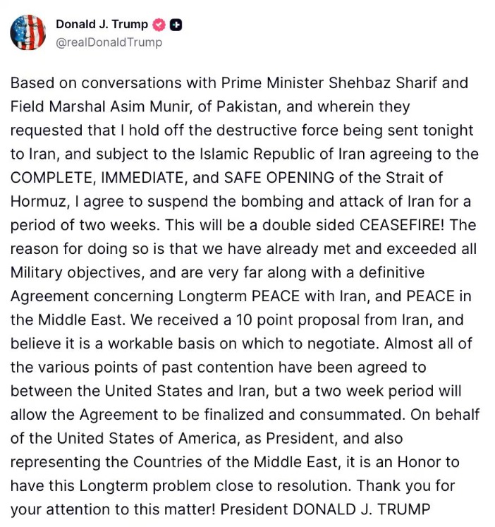 特朗普在社交媒体发文称,同意暂停对伊朗的轰炸和攻击,为期两周。