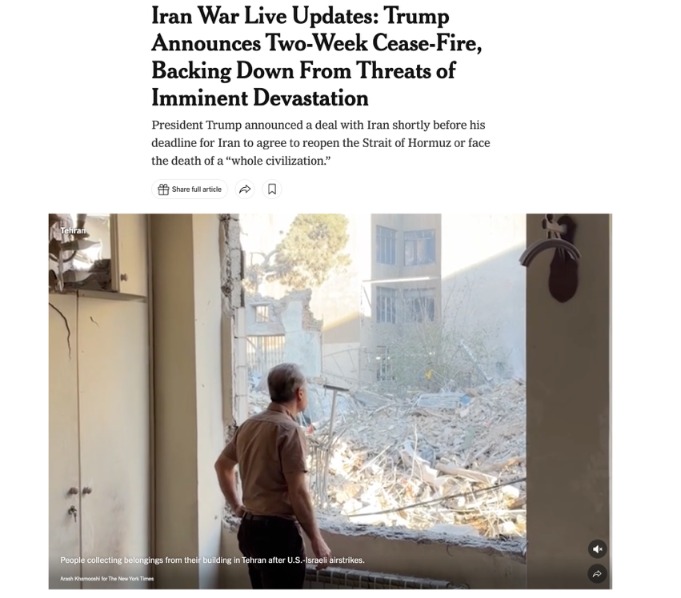 《纽约时报》报道,特朗普宣布停火两周,放弃了对伊朗发动毁灭性打击的威胁。