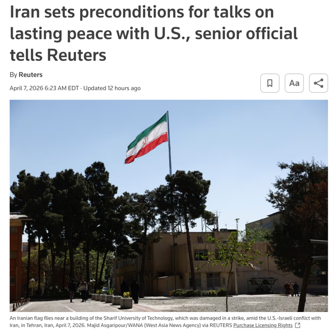 路透社报道,伊朗高级官员称,伊朗为与美国的和谈设定了先决条件。