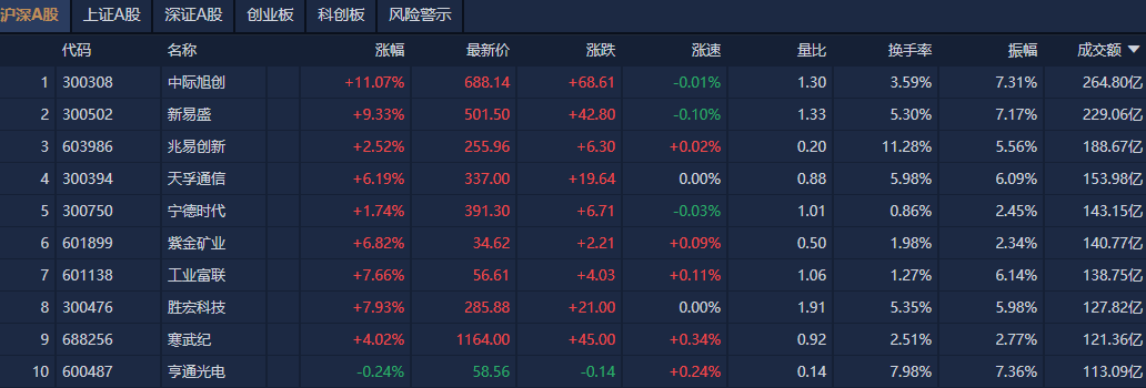 个股方面,中际旭创全天成交额超264亿元位居沪深两市第一,新易盛、兆易创新、天孚通信等个股成交额位居前列。