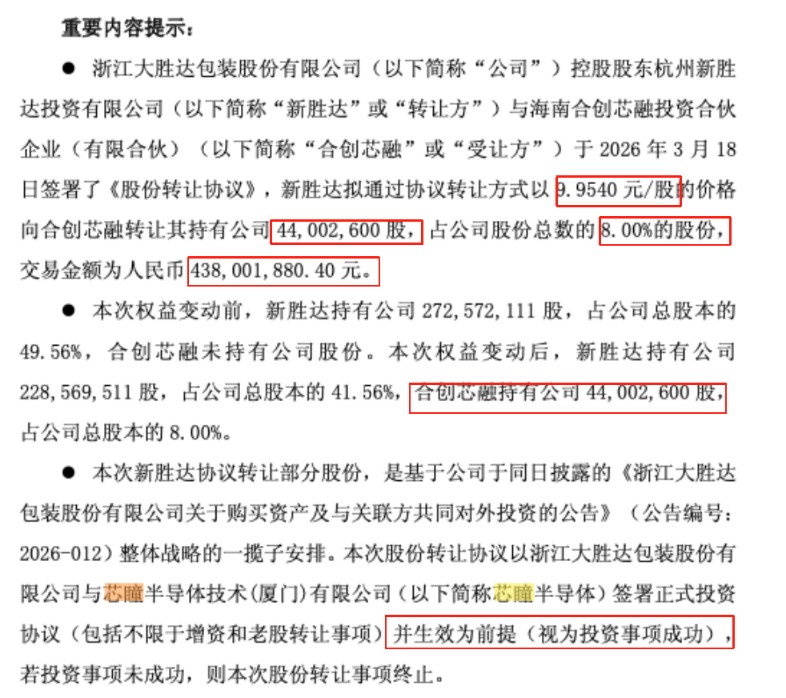 与大胜达投资芯瞳半导体同步披露的是,控股股东新胜达的股份转让计划。
