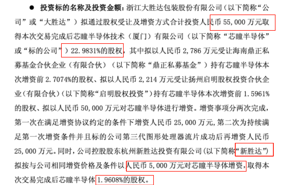 据了解,大胜达的半导体投资方案由两部分构成,股权受让与增资。