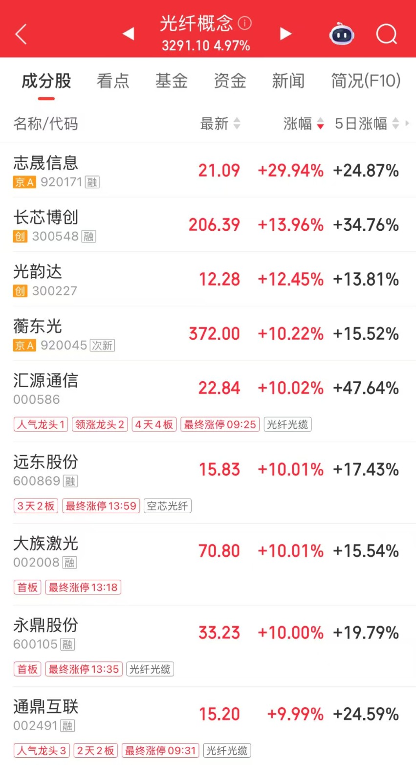 今日,光纤概念持续走高。永鼎股份涨停,续创历史新高;通鼎互联2连板;长飞光纤回升翻红,早盘一度跌超4%。