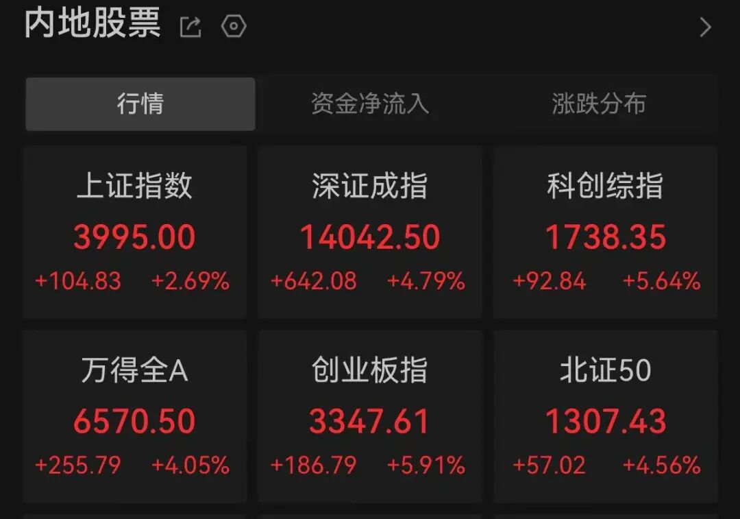 4月8日,A股三大指数集体大涨。上证指数涨2.69%,收下百点长阳,直逼4000点关口,深证成指涨4.79%,创业板指涨5.91%,科创综指涨5.64%。全市场超5100只个股上涨,135只个股涨停,连续两日百股涨停。两市成交额24506亿元,较前一交易日增加8271亿元。