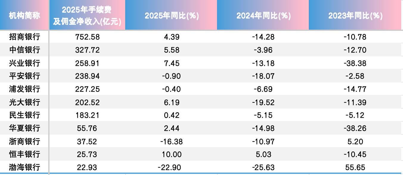 值得一提的是,与此前相比,2025年股份行手续费及佣金净收入整体呈现好转态势。2024年,11家股份行中,除恒丰银行手续费及佣金净收入同比增长外,其余10家无一例外全部下滑,且有7家降幅超过1成。