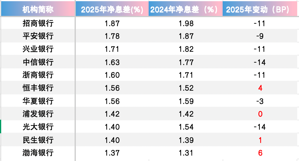 支撑股份行利息净收入整体好转的因素之一是净息差降幅收窄。11家股份行中,有3家(恒丰银行、民生银行、渤海银行)净息差逆势回升,1家(浦发银行)持平,其余7家下降。而2024年这11家股份行中,有10家都出现了下降。金融监管总局发布的数据也显示,2025年末,股份行净息差平均为1.56%,降幅5BP,而2024年末降幅则为15BP。