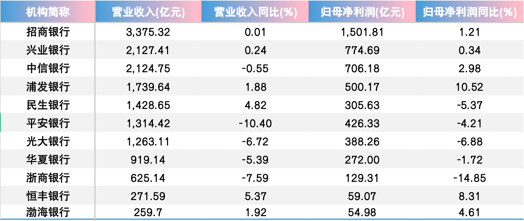 分化尤为明显:招商银行、兴业银行、浦发银行、渤海银行和恒丰银行等5家营收和归母净利润同比实现“双增”;平安银行、光大银行、华夏银行和浙商银行则遭遇“双降”。其余2家中,中信银行增利不增收,民生银行则增收不增利。