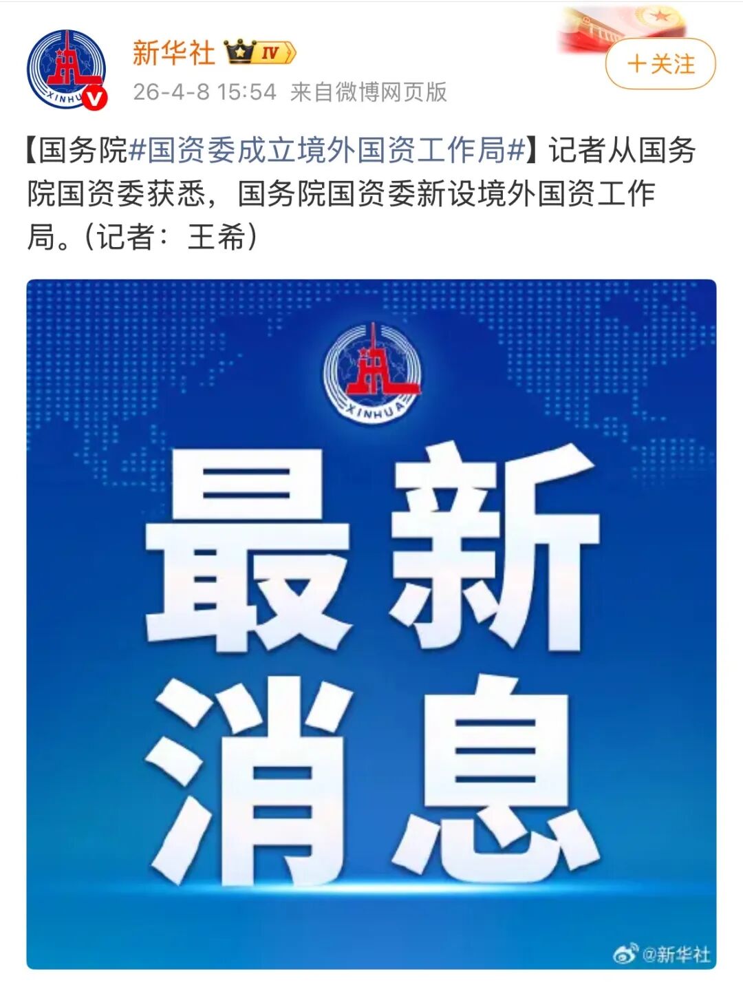 记者从国务院国资委获悉,国务院国资委新设境外国资工作局。