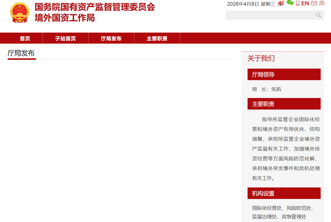 国务院国资委官网显示,国务院国资委境外国资工作局主要职责为指导所监管企业国际化经营和境外资产布局优化、结构调整,承担所监管企业境外资产监督有关工作,加强境外投资经营等方面风险防范化解,承担境外突发事件和危机处理有关工作。机构设置包括:国际化经营处、风险防范处、监督治理处、应急管理处。