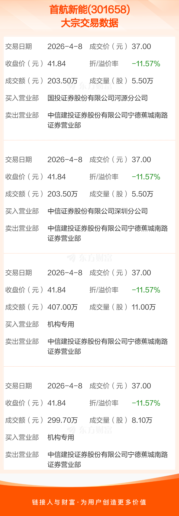 2026年4月8日,首航新能发生4笔大宗交易,共成交30.10万股,成交金额1113.70万元,占其流通市值比例为0.27%。