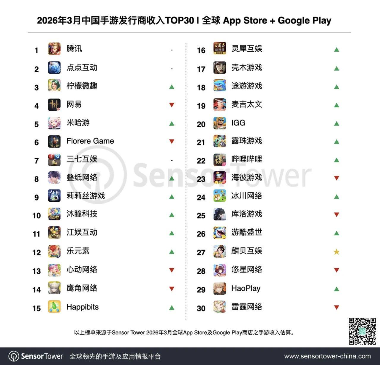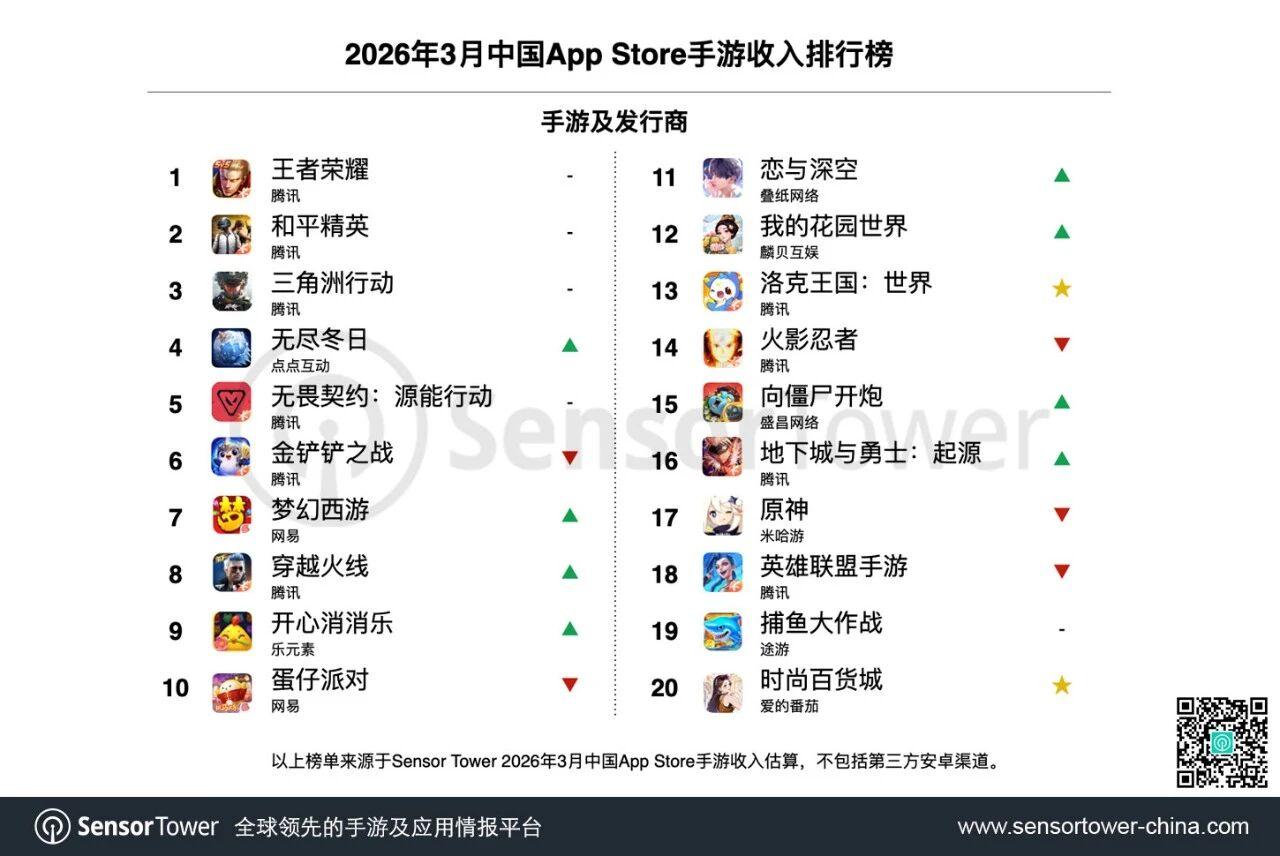 国内市场方面,腾讯包揽中国AppStore手游收入榜前三,《王者荣耀》《和平精英》《三角洲行动》位列榜首。腾讯新游《洛克王国:世界》3月中下旬上线,依托经典IP与开放世界玩法,上线一周收入近1300万美元,登顶iOS手游畅销榜,位列国内收入榜第13名。