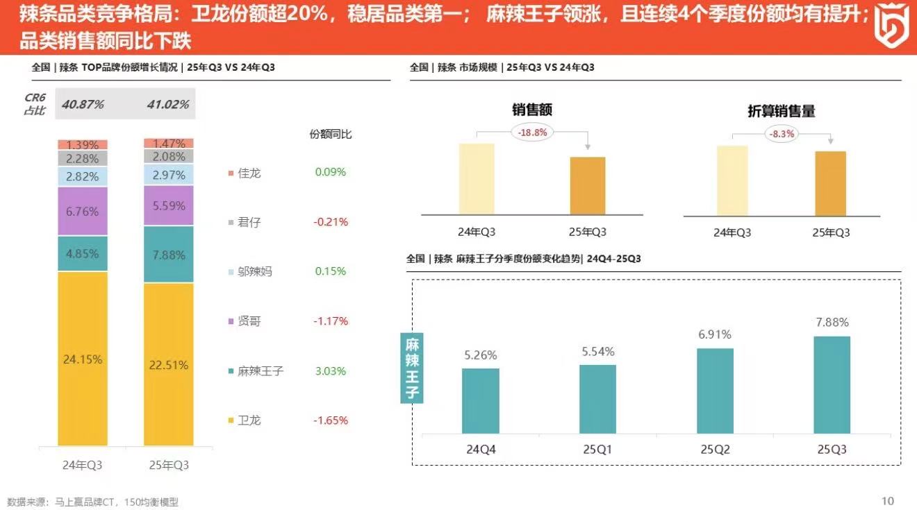 当然卫龙辣条收入下滑和整体市场收缩有关。马上赢数据显示,辣条市场整体规模正在缩水,其2025年三季度同比下滑18%。但卫龙辣条的市占率从2024年三季度的24.2%下滑至22.5%,与此同时麻辣王子的市占率从4.9%增至7.9%,稳坐辣条行业第二的位置。