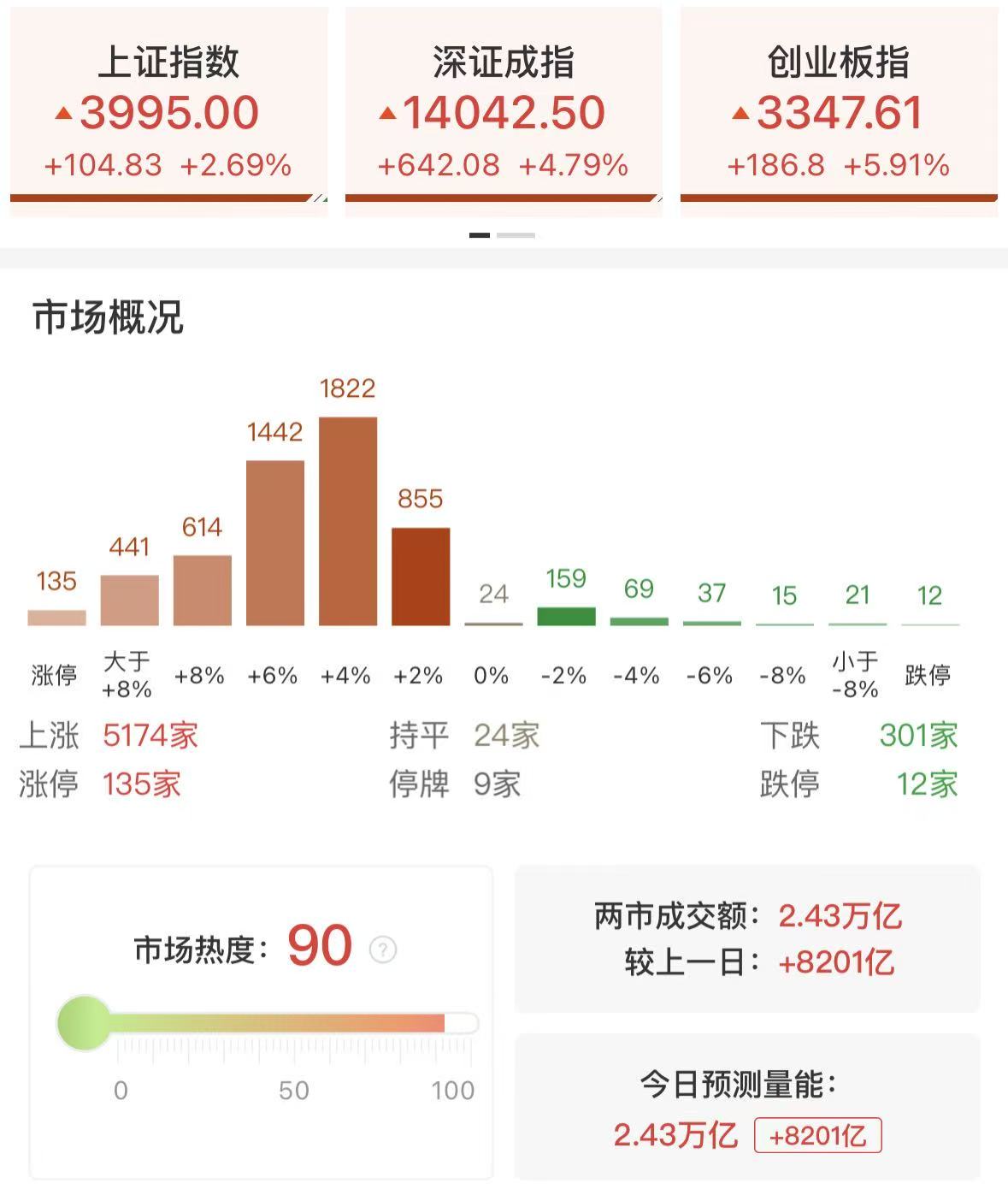 财联社4月8日讯,市场集体反弹,沪指百点长阳,创业板指涨近6%、科创50指数涨超6%。量能明显放大,沪深两市成交额2.43万亿,较上一个交易日放量8201亿。盘面上,市场热点快速轮动,全市场超5100只个股上涨,其中135只个股涨停,连续两日超百股涨停。从板块来看,AI产业链集体爆发,其中算力租赁概念走强,大位科技、行云科技、奥瑞德、杭钢股份、华孚时尚涨停。算力硬件概念快速拉升,中际旭创涨超10%,刷新历史高点,铭普光磁、东山精密、沪电股份、深南电路等多股涨停。AI应用端表现活跃,十余只成分股涨停,蓝色光标20cm涨停,志晟信息30cm涨停。贵金属概念集体走高,湖南黄金、四川黄金、西部黄金涨停。下跌方面,油气概念集体调整,中曼石油、贝肯能源、蓝焰控股跌停。截至收盘,沪指涨2.7%,深成指涨4.79%,创业板指涨5.91%。