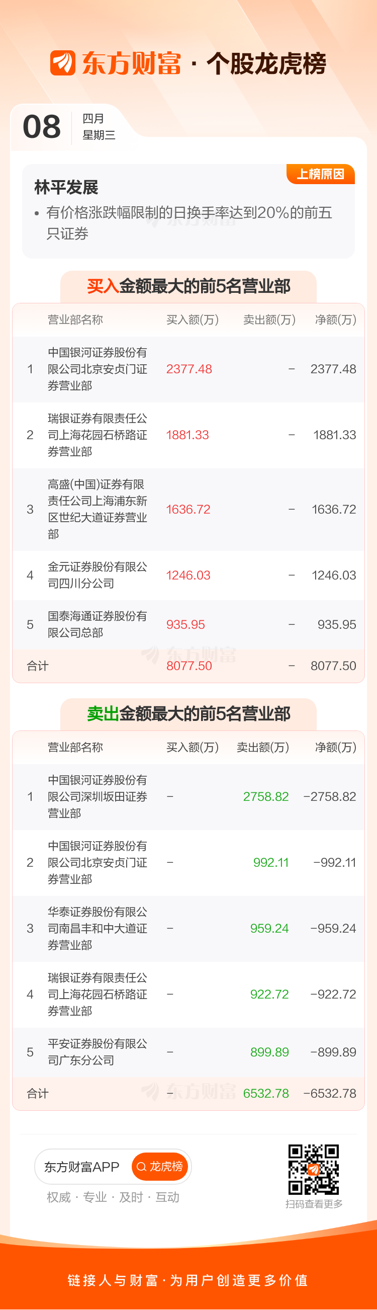 交易所2026年4月8日公布的交易公开信息显示,林平发展因成为有价格涨跌幅限制的日换手率达到20%的前五只证券上榜。林平发展当日收报52.9元,涨跌幅3.10%,偏离值32.13%,换手率32.13%,成交额3.08亿。