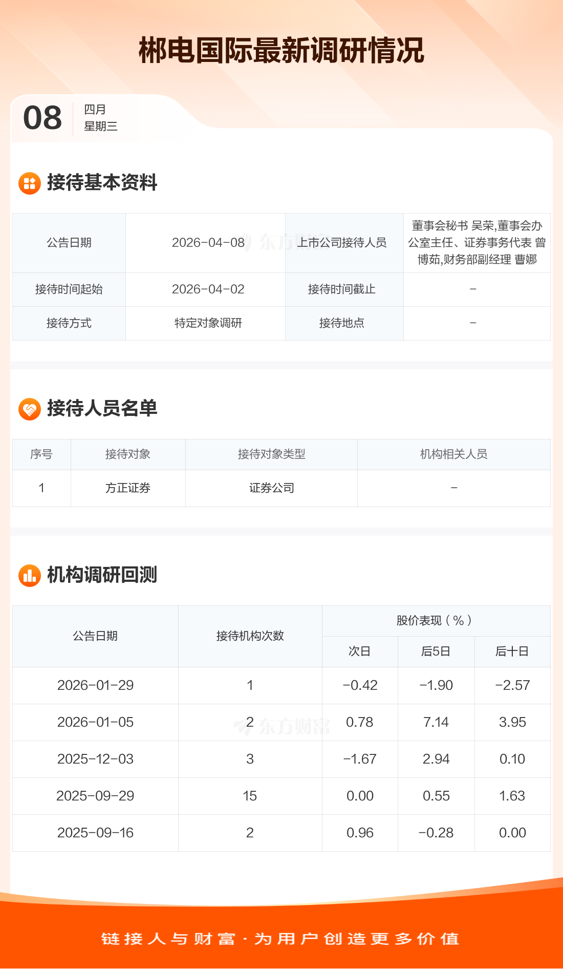 郴电国际4月8日公告称,4月2日接待方正证券等1家机构调研。接待人员包括董事会秘书 吴荣,董事会办公室主任、证券事务代表 曾博茹,财务部副经理 曹娜。