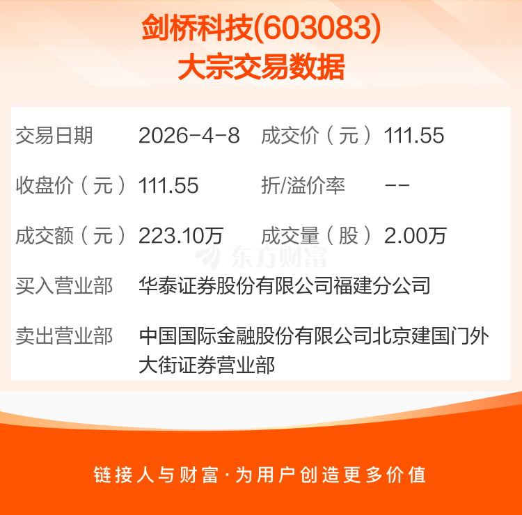 2026年4月8日,剑桥科技发生1笔大宗交易,共成交2.00万股,成交金额223.10万元。