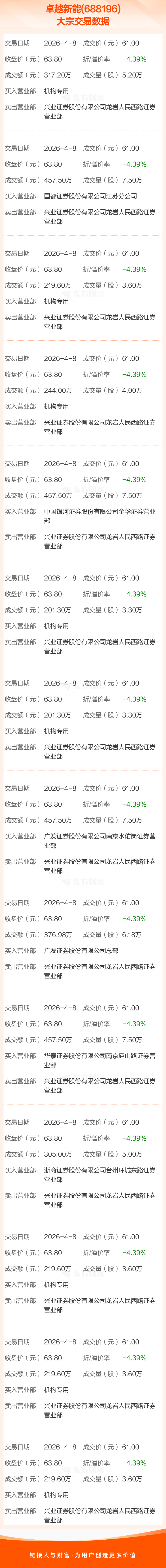 2026年4月8日,卓越新能发生14笔大宗交易,共成交71.38万股,成交金额4354.18万元,占其流通市值比例为0.57%。