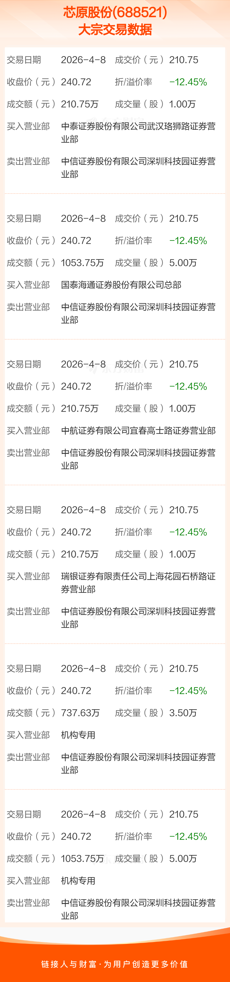 6笔大宗交易成交均价210.75元,较该股当日收盘价240.72元折价12.45%。