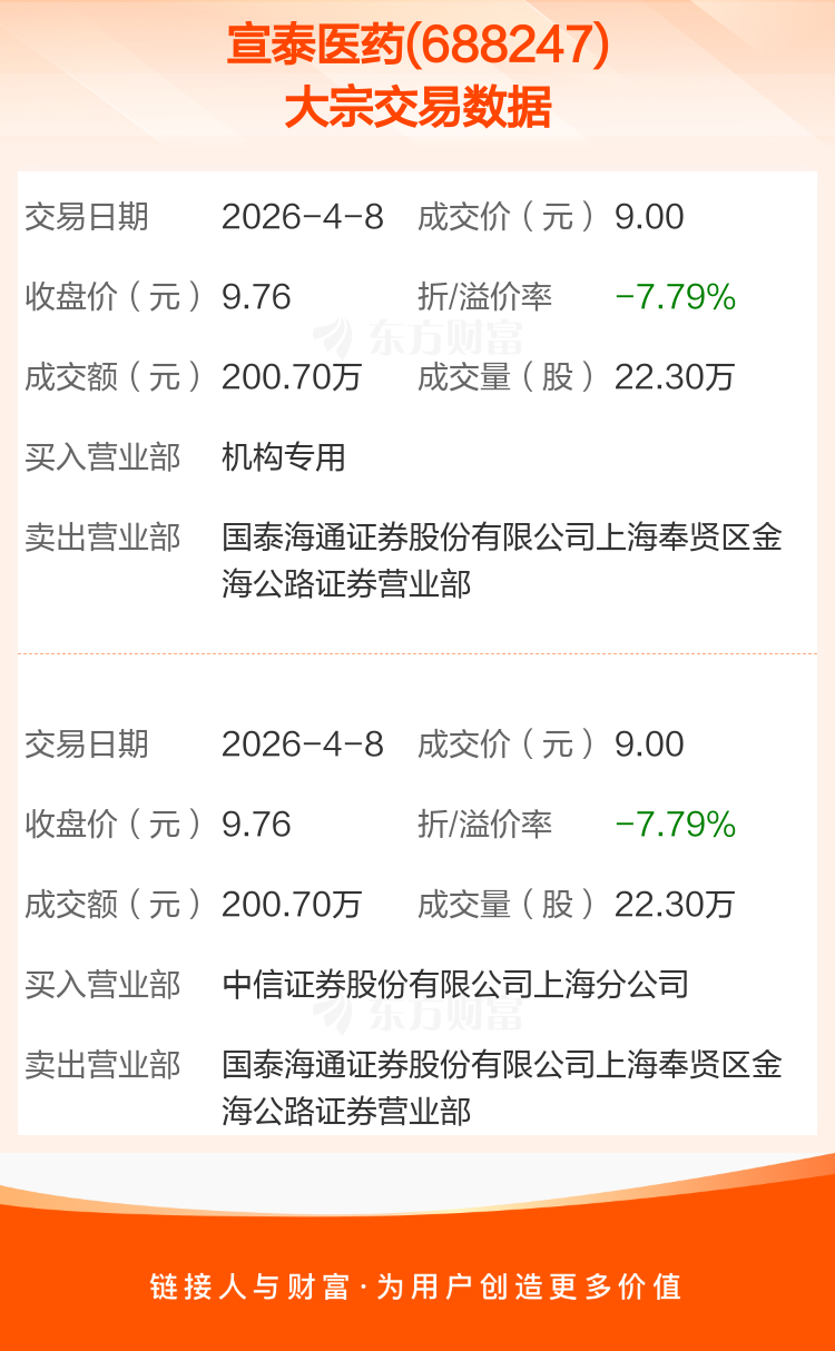 2026年4月8日,宣泰医药发生2笔大宗交易,共成交44.60万股,成交金额401.40万元,占其流通市值比例为0.09%。