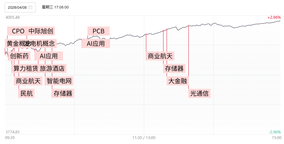 财联社4月8日讯,今日123股涨停,17股炸板,封板率为88%,汇源通信4连板,中安科3连板,美诺华13天7板,新中港6天5板,神剑股份9天5板,中工国际4天3板,九州一轨20cm 3天2板。市场集体反弹,沪指百点长阳,创业板指涨近6%、科创50指数涨超6%。量能明显放大,沪深两市成交额2.43万亿,较上一个交易日放量8201亿。盘面上,市场热点快速轮动,全市场超5100只个股上涨,连续两日超百股涨停。板块方面,贵金属、AI应用、算力租赁、算力硬件方向领涨;油气、煤炭板块逆势走弱。截至收盘,沪指涨2.7%,深成指涨4.79%,创业板指涨5.91%。