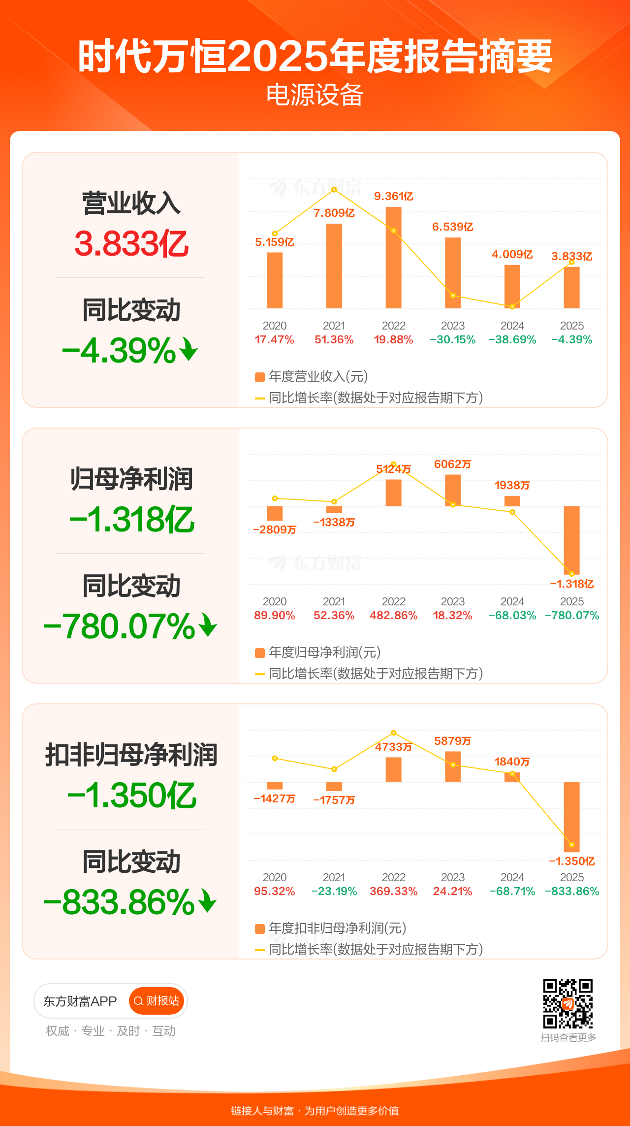 时代万恒4月9日发布2025年年报显示,公司全年实现营业收入3.83亿元,同比下滑4.39%;归母净利润-1.32亿元;扣非归母净利润-1.35亿元。