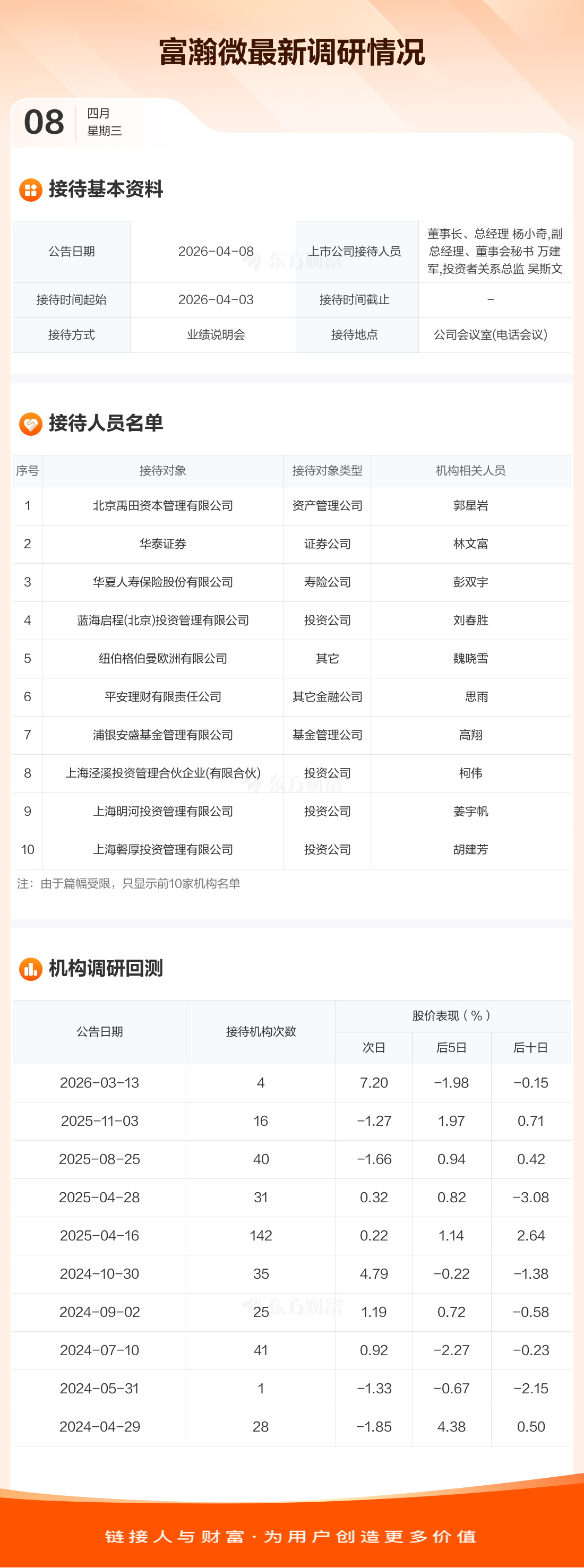 富瀚微4月8日公告称,4月3日接待北京禹田资本管理有限公司等31家机构调研。接待人员包括董事长、总经理 杨小奇,副总经理、董事会秘书 万建军,投资者关系总监 吴斯文。