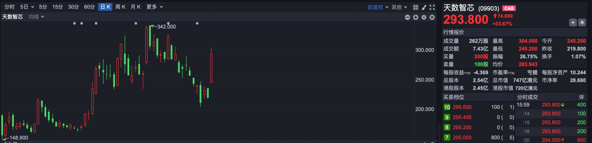 市场热点方面,半导体概念股领涨市场。其中,天数智芯(HK09903)大涨33.67%。此外,华虹半导体涨超14%,澜起科技、上海复旦、爱芯元智、中芯国际涨超10%。