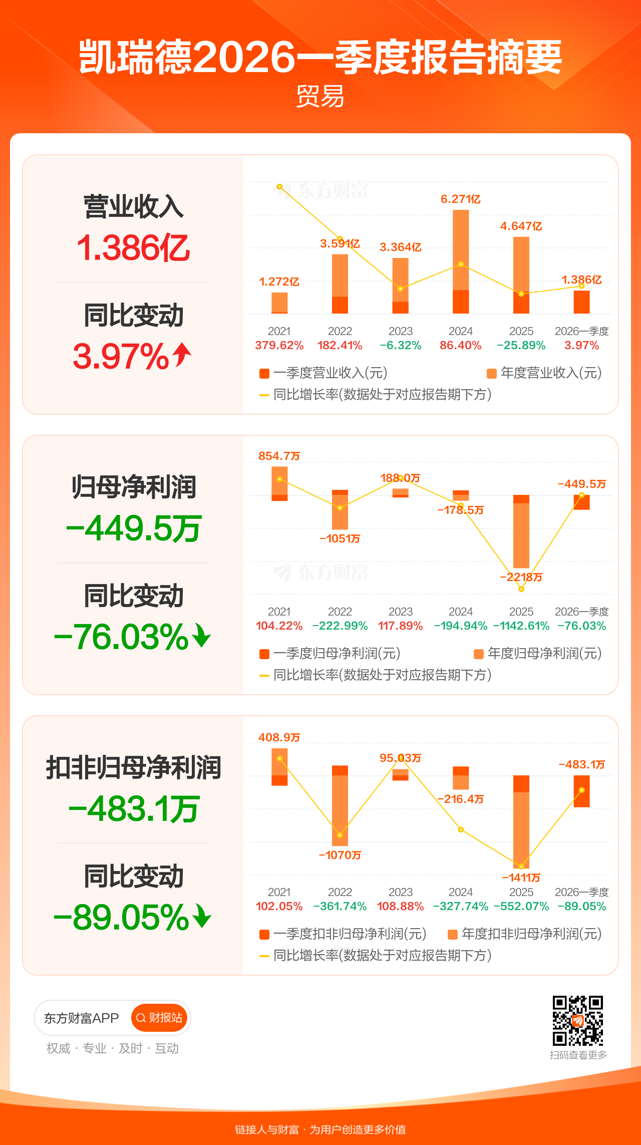 凯瑞德4月9日发布2026年一季报显示,公司一季度实现营业收入1.39亿元,同比增长3.97%;归母净利润-449.48万元;扣非归母净利润-483.06万元。