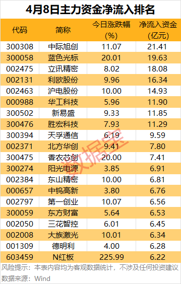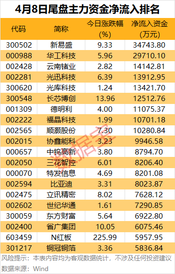 个股方面,新易盛、华工科技尾盘主力资金净流入金额分别为3.47亿元、2.97亿元;云南锗业、光迅科技、光库科技、长芯博创等个股尾盘主力资金净流入金额均超1亿元。