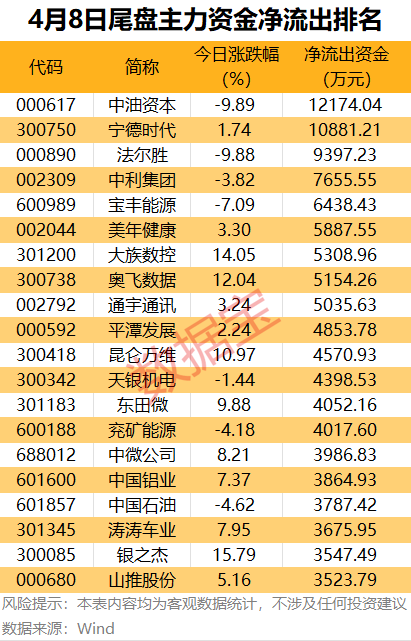 尾盘主力资金净流出方面,中油资本、宁德时代尾盘主力资金净流出均超1亿元,法尔胜、中利集团、宝丰能源、美年健康等尾盘主力资金净流出金额均超5000万元。