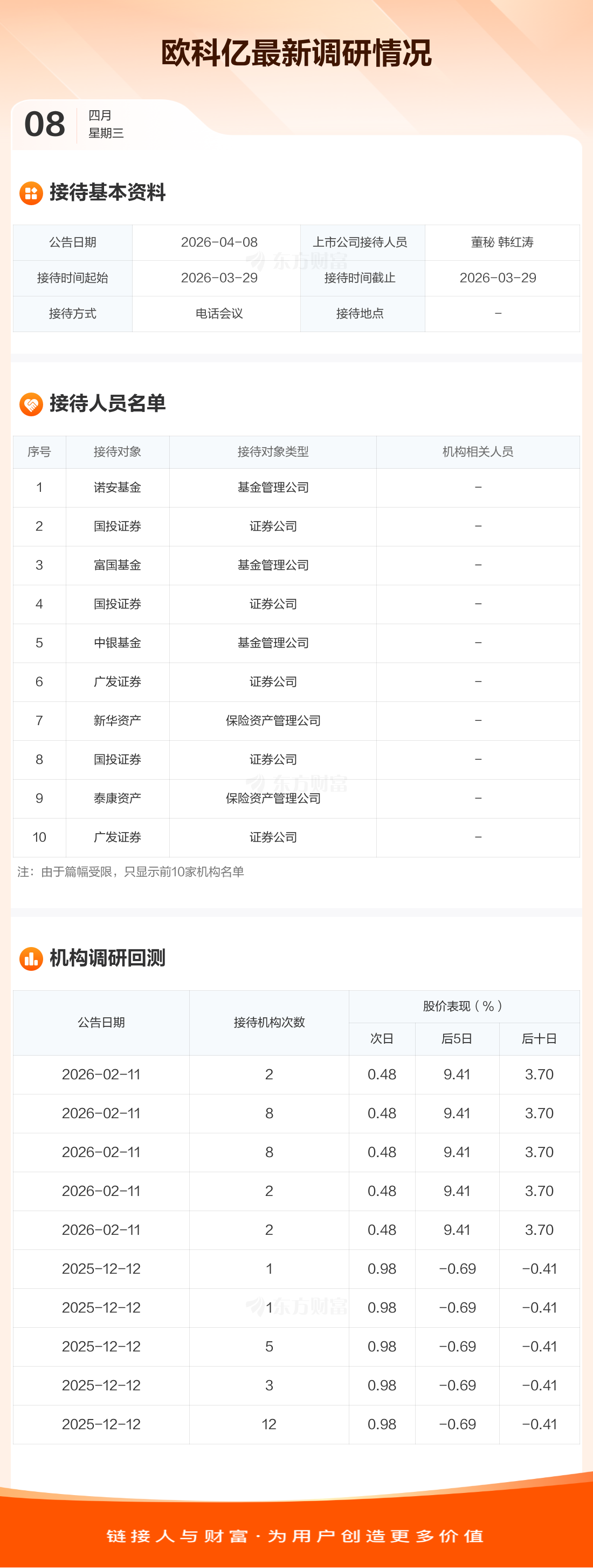 欧科亿4月8日公告称,3月29日接待诺安基金等43家机构调研。接待人员包括董秘 韩红涛。
