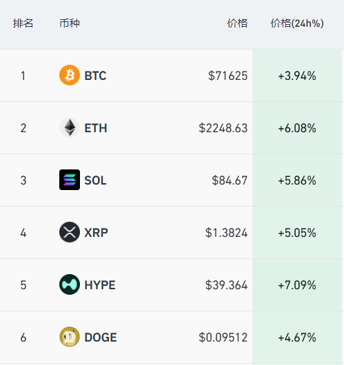 加密货币保持涨势,比特币涨近4%报71625美元/枚,以太坊涨超6%,SOL、XRP涨超5%,狗狗币涨超4%。过去24小时,全市场近12万人被爆仓。