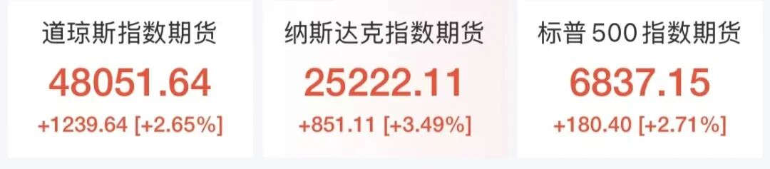 美股三大股指期货持续走高,道琼斯指数期货涨2.65%,纳斯达克指数期货涨3.49%,标普500指数期货涨2.71%。