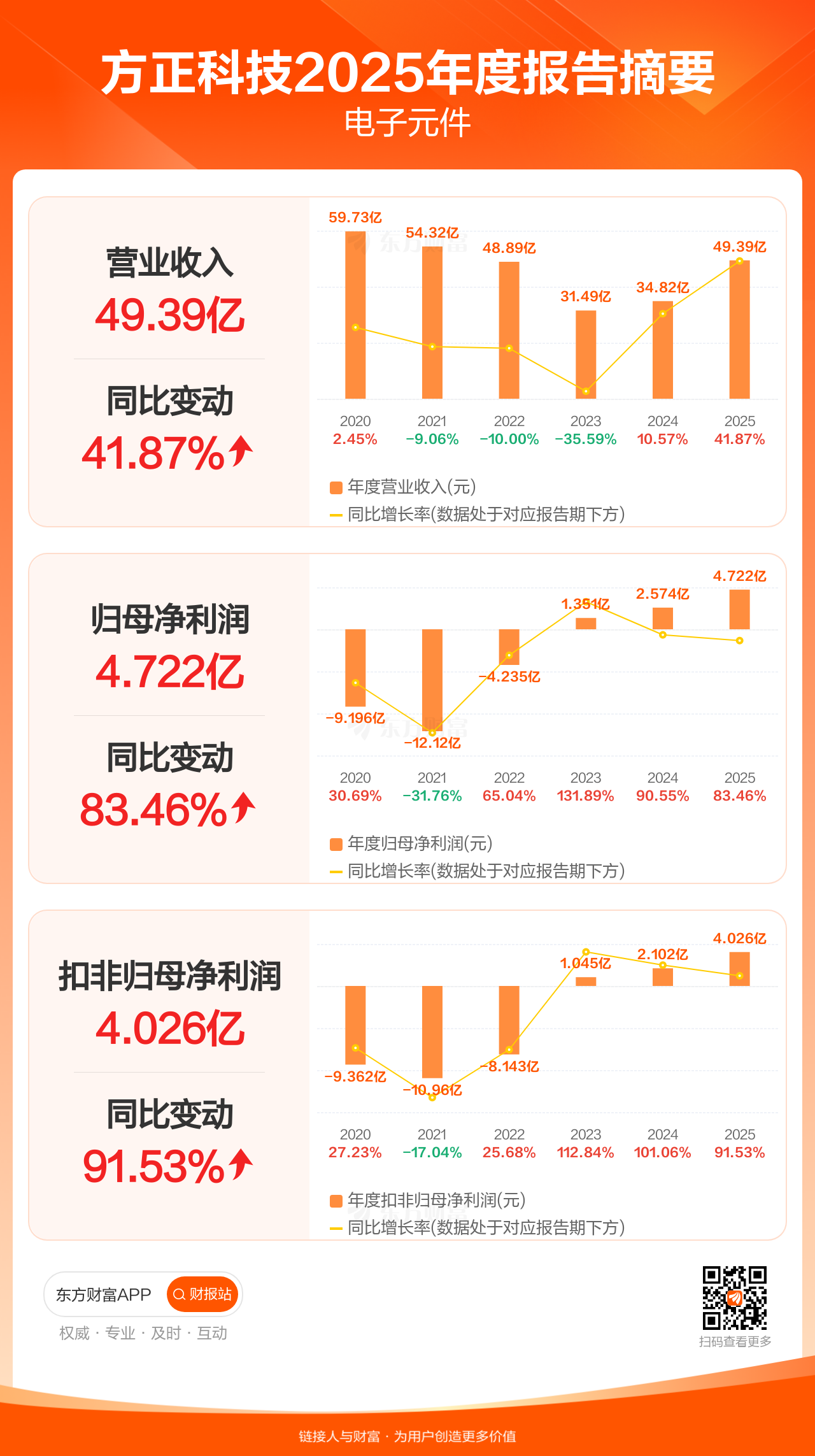 方正科技4月9日发布2025年年报显示,公司全年实现营业收入49.39亿元,同比增长41.87%;归母净利润4.72亿元,同比增长83.46%;扣非归母净利润4.03亿元,同比增长91.53%。
