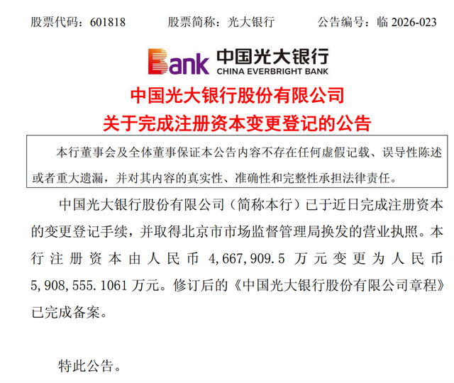 4月8日,光大银行发布公告称,本行已完成注册资本的变更登记手续,并取得北京市市场监督管理局换发的营业执照。注册资本由人民币466.791亿元变更为人民币590.856亿元,修订后的公司章程已完成备案。