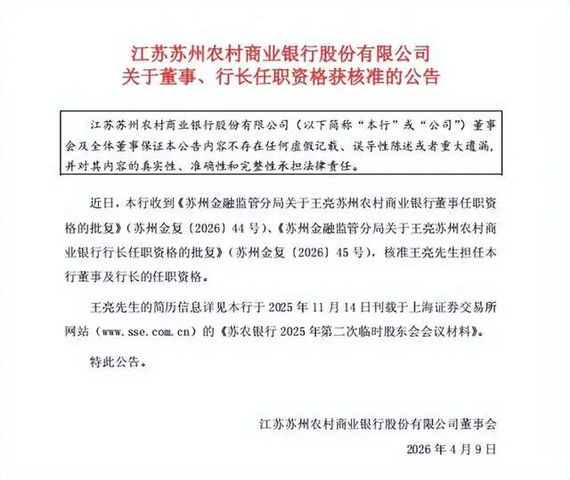 4月8日,苏州农商行发布公告指出,近日,该行收到《苏州金融监管分局关于王亮苏州农村商业银行董事任职资格的批复》《苏州金融监管分局关于王亮苏州农村商业银行行长任职资格的批复》,核准王亮担任该行董事及行长的任职资格。