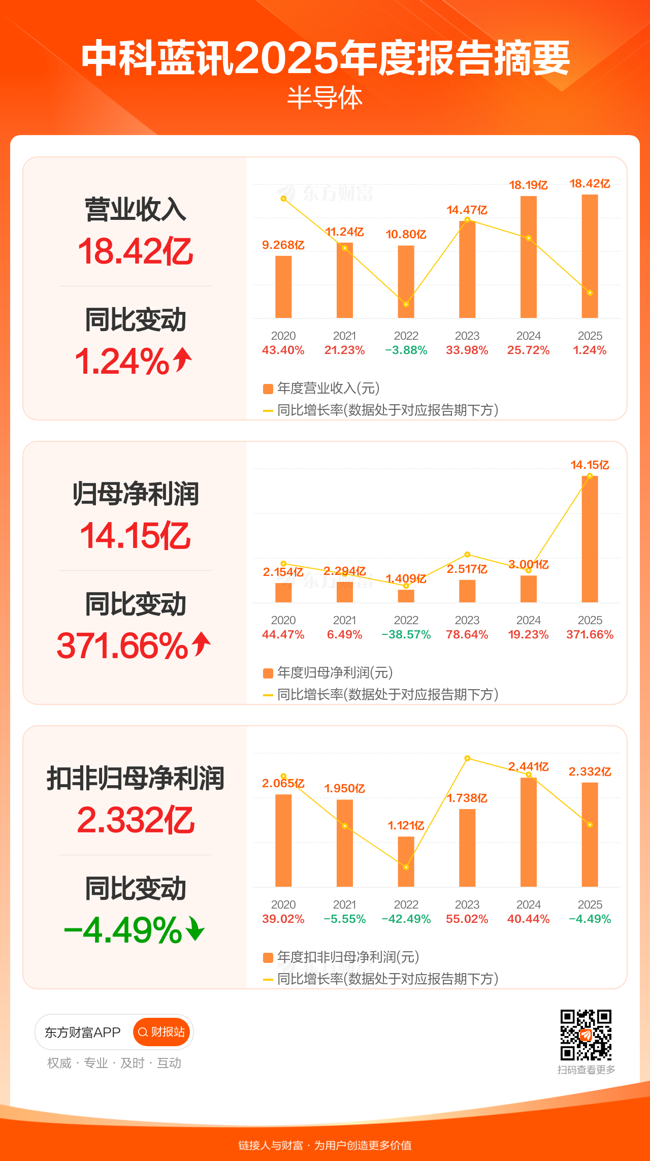 中科蓝讯4月9日发布2025年年报显示,公司全年实现营业收入18.42亿元,同比增长1.24%;归母净利润14.15亿元,同比增长371.66%;扣非归母净利润2.33亿元,同比下滑4.49%。
