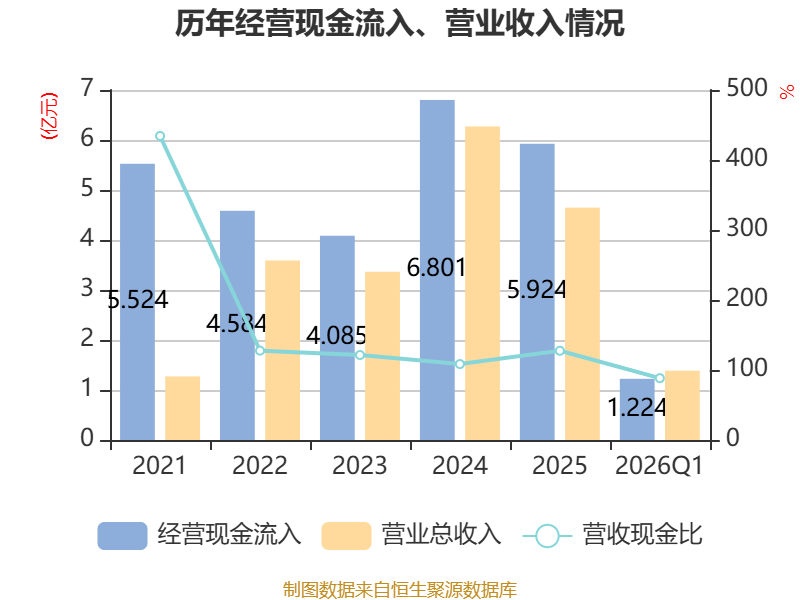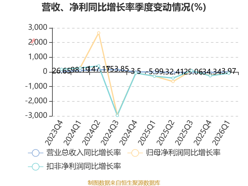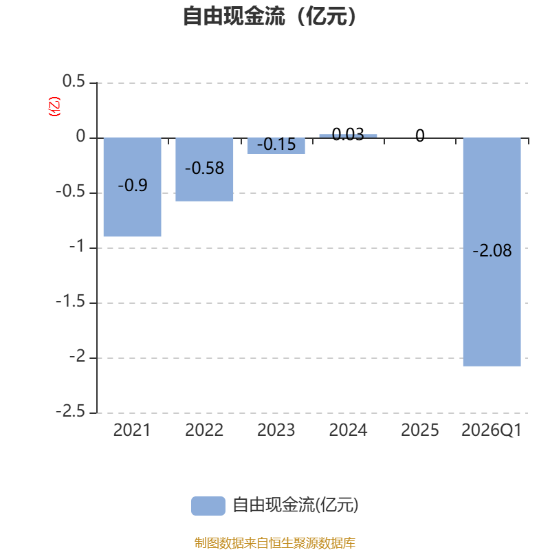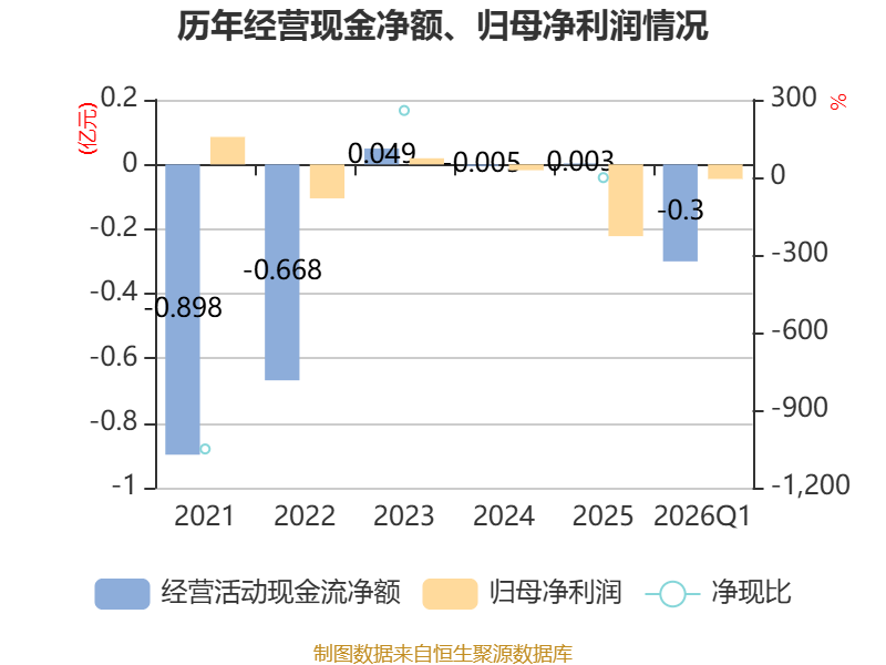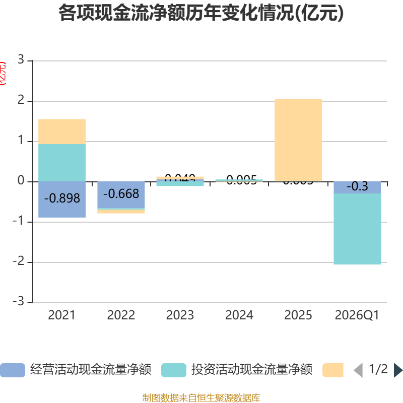 截至2026年一季度末,公司经营活动现金流净额为-3002.45万元,同比减少2861.31万元;筹资活动现金流净额-12.6万元,同比减少12.6万元;投资活动现金流净额-1.76亿元,上年同期为0元。