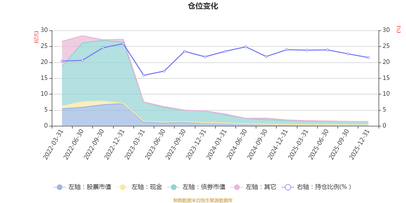 据定期报告数据统计,近三年平均股票仓位为22.02%,同类平均为19.2%。2022年末基金达到25.84%的最高仓位,2023年一季度末最低,为15.91%。