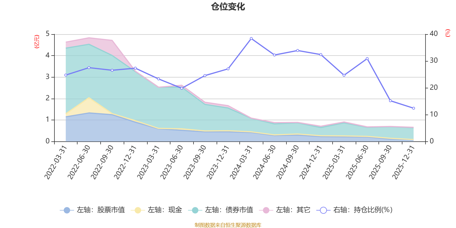 据定期报告数据统计,近三年平均股票仓位为26.25%,同类平均为19.2%。2024年一季度末基金达到38.39%的最高仓位,2025年末最低,为12.41%。