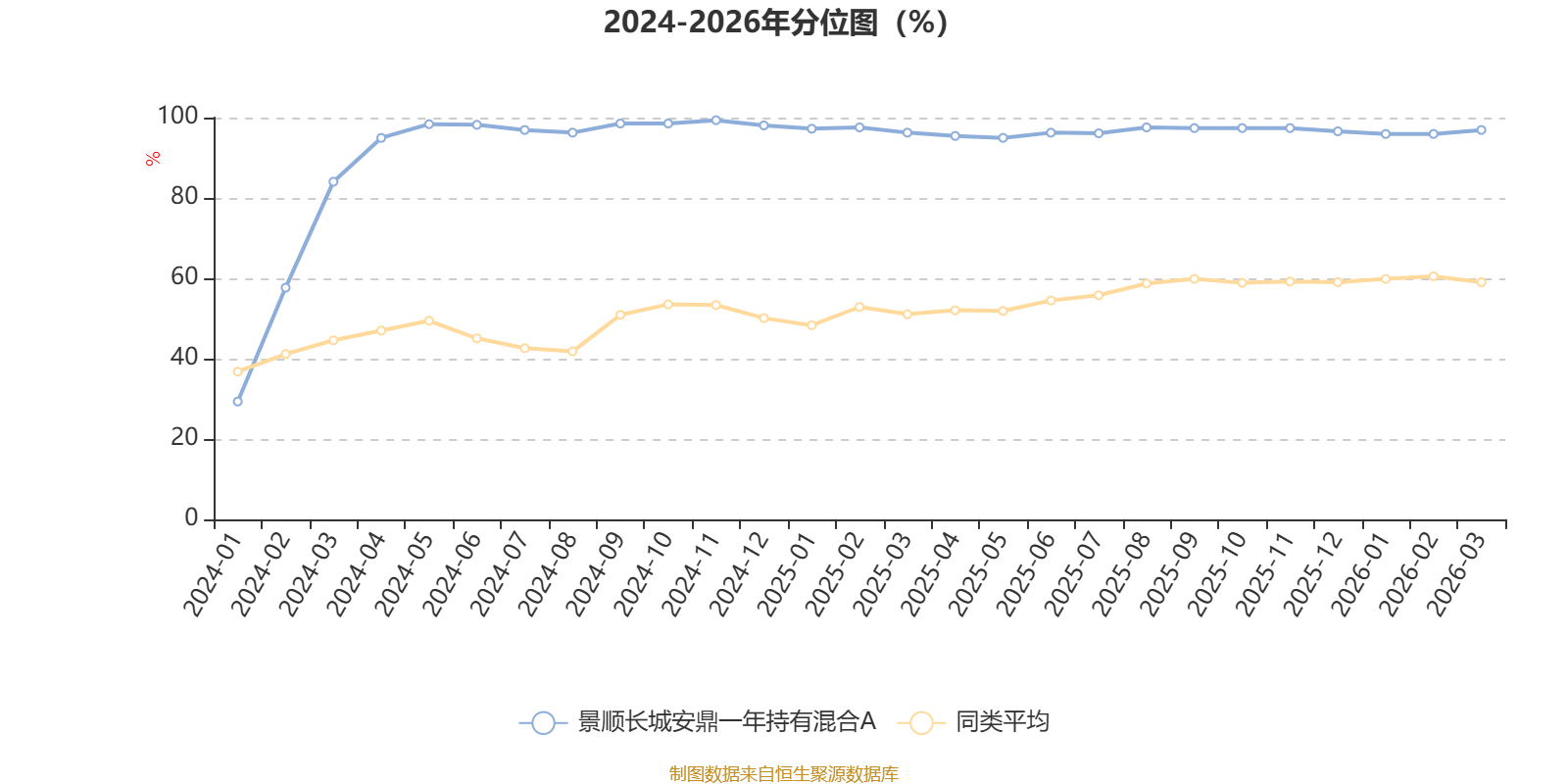 通过所选区间该基金净值增长率分位图,可以观察该基金与同类基金业绩比较情况。图为坐标原点到区间内某时点的净值增长率在同类基金中的分位数。