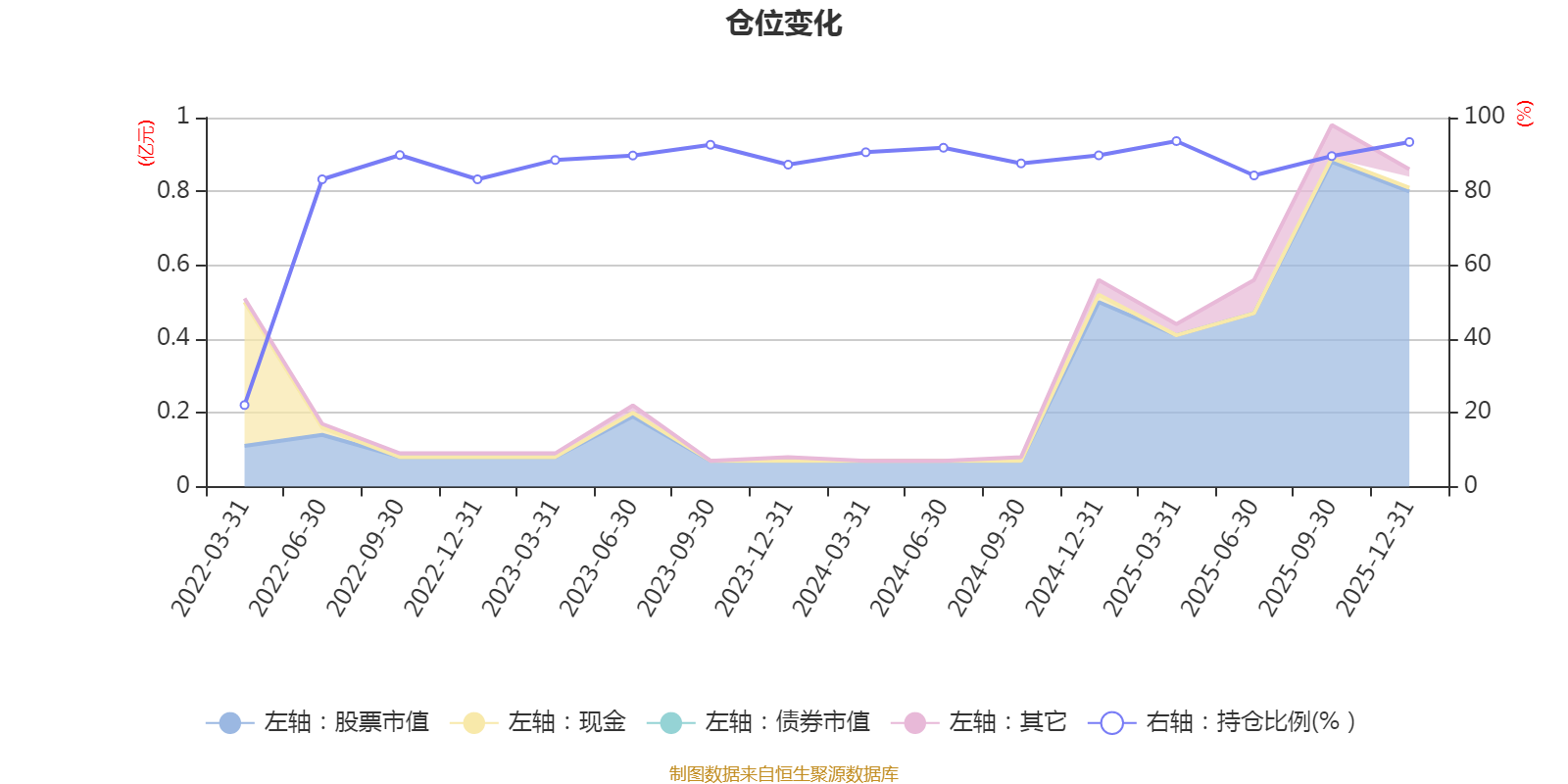 据定期报告数据统计,近三年平均股票仓位为89.9%,同类平均为88.6%。2025年一季度末基金达到93.63%的最高仓位,2022年一季度末最低,为22.09%。