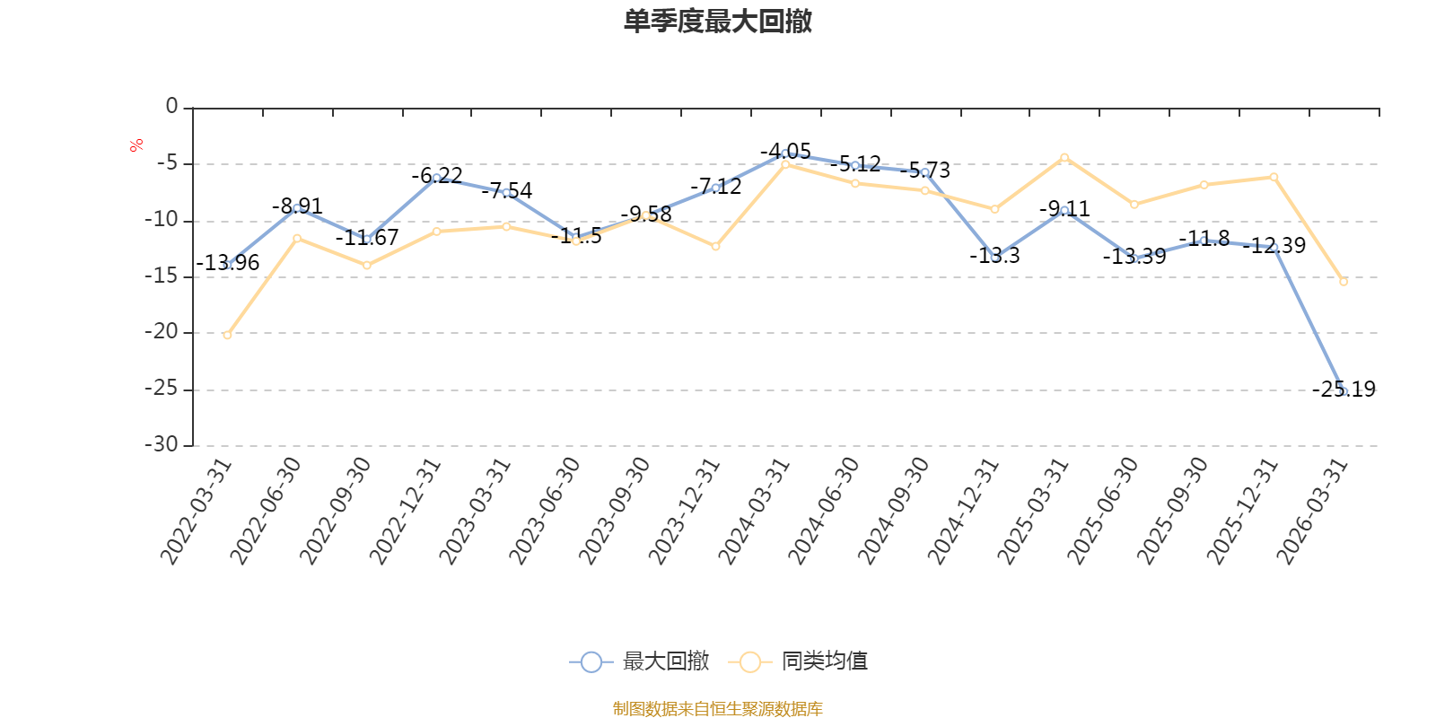截至4月7日,基金近三年最大回撤为29.26%,同类可比基金排名4/5。单季度最大回撤出现在2026年一季度,为25.19%。