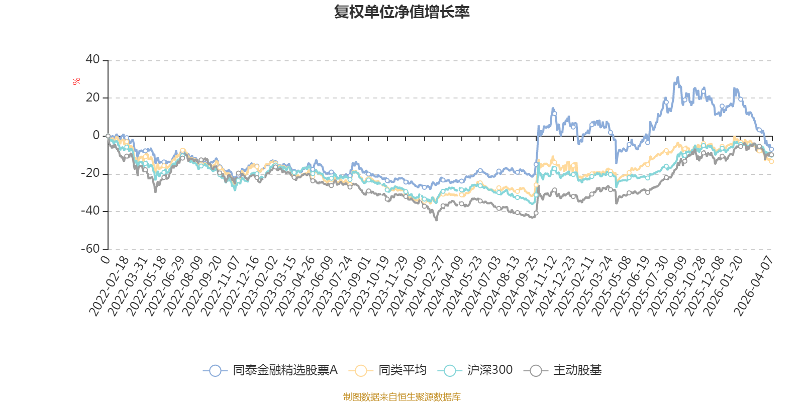 截至4月7日,同泰金融精选股票A近三个月复权单位净值增长率为-25.26%,位于同类可比基金5/6;近半年复权单位净值增长率为-25.72%,位于同类可比基金5/6;近一年复权单位净值增长率为9.08%,位于同类可比基金6/6;近三年复权单位净值增长率为12.05%,位于同类可比基金3/5。