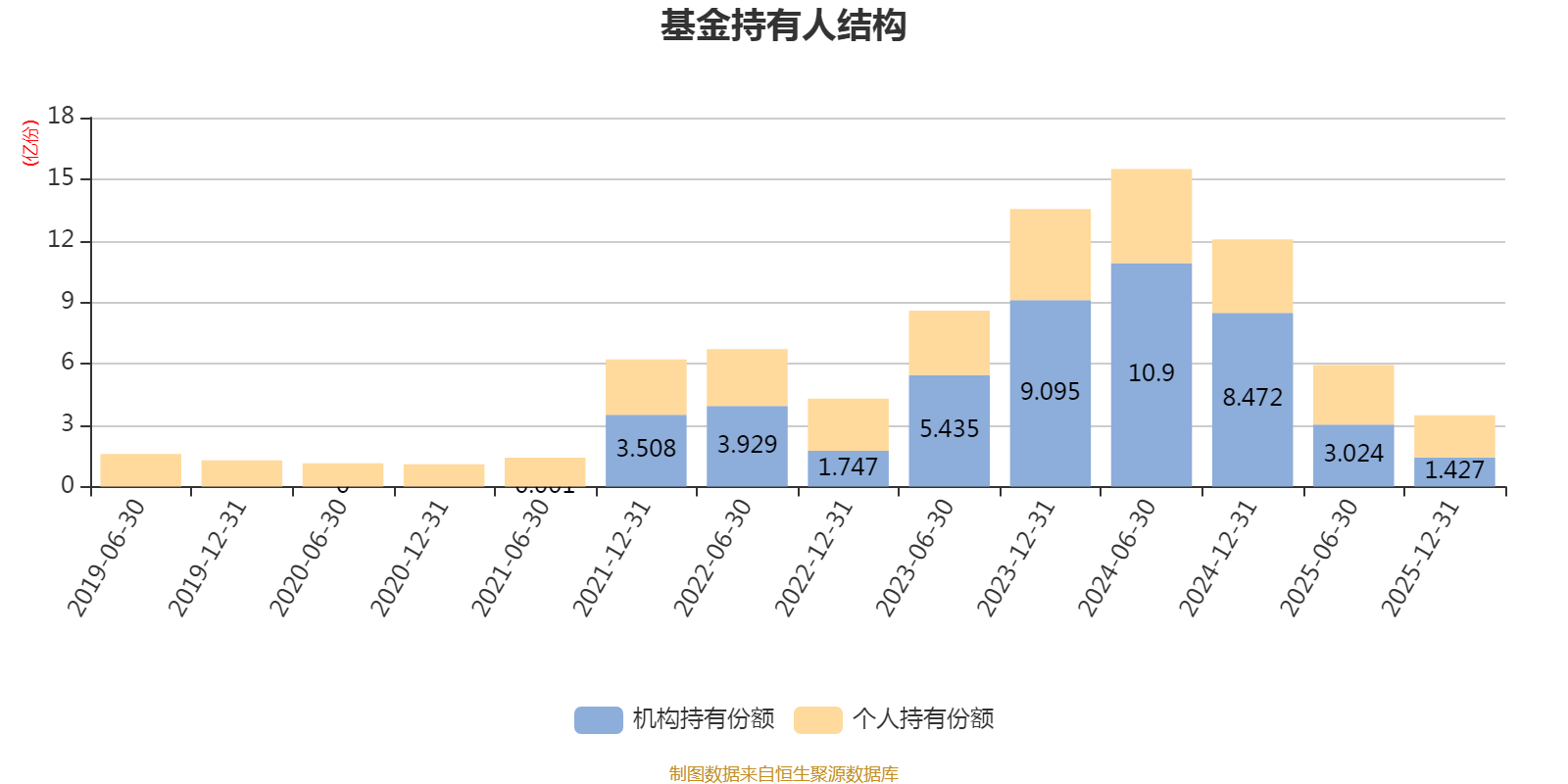 截至2025年12月31日,基金持有人共计16.64万户,合计持有3.47亿份。其中管理人员工持有292.6万份,占比0.84%,机构持有份额占比41.08%,个人投资者占比58.92%。